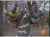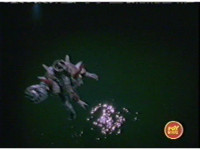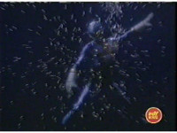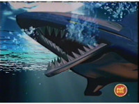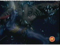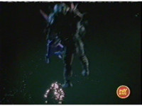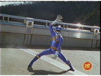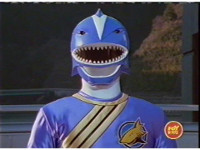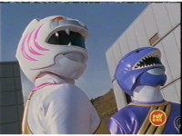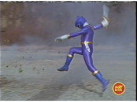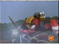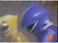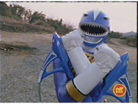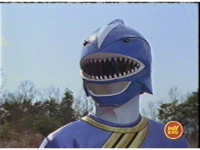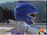 Blue undives out of the lake, grabs Turbine Org, and pulls him into the water, where he sparkily claws him twice, before the Org activates his turbines and blows the Ranger away. |