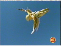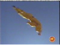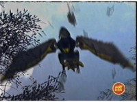 Eaglezord dives down, and flaps her wings to slow her down, Yellow talks with a raised fist, Eagle shrieks, then begins to flap bolts of yellow energy forth, exploding all around Turbine Org. |