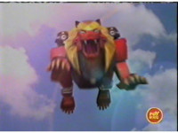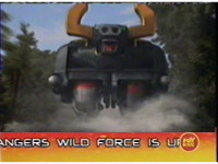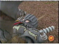 White Tiger races through the forest growling, White nod-talks, then the Wildzord curls up and flips over, then unsheathes her claws and sparkily strikes Turbine Org. |