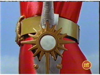 Each Ranger places their Animal Crystal into their Crystal Saber, causing them to shimmer and glow with power as Red raises his in the air. |