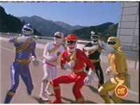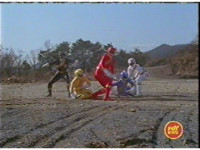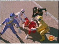 As Blue & Yellow fall, the other three Rangers regroup around them. |