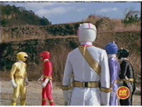 Red lands on his back and writhes, then begins to sit up, as his chest badge begins to glow, he touches his chest, then turns to his teammates, who recover slowly, Yellow nod-talking then rushing forth, only to be stopped by Red, who talks, getting Yellow to pause, the others all listening, as he talks some more, White responds, then Black. |