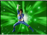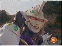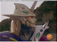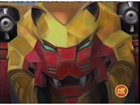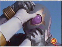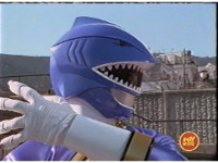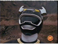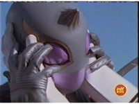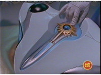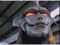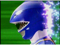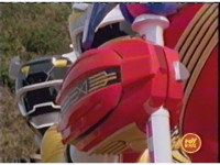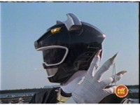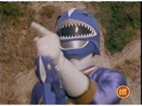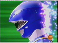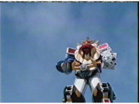 Wild Force Megazord passes its Fin Blade over its face, changing to a fierce expression. |