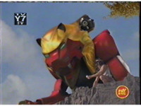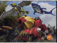 Red Lion roars, Bison's back shifts around into legs, Eagle locks in her wings behind Red Lion's chest head, causing the Wild Force Megazord's head to the pop up out of her, eyes glowing, before the Megazord then flies forth. |