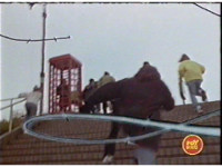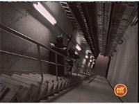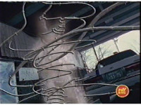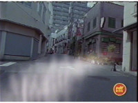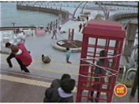Japanese civilians flee up stairs as barbed wire whips across the scene, and wraps around a phonebooth. |