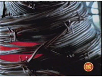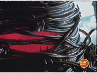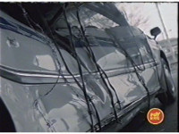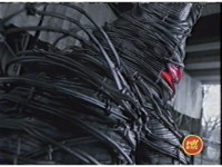 Barbed wire wraps around the car, then crushes the vehicle, the cat watching, then the Org turns and leaves the smoking car. |