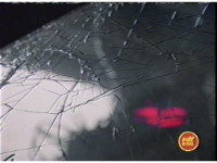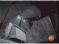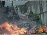 Cuts before it crushes booth, cuts follow-up of girl within crying, then follow-ups of people being attacked. |