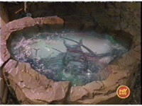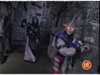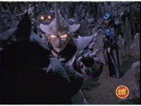 Pan up from the crackling Org goop to Jindrax & Toxica teleporting in, the Rangers react, Blue pointing and talking, Jindrax responding. |