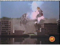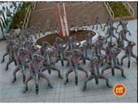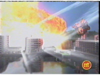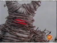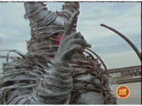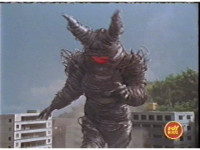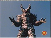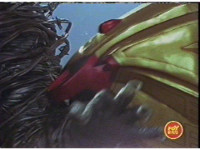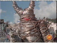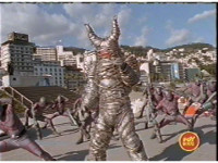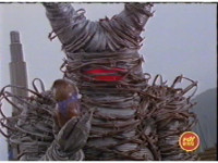 As the Rangers stand in the cockpit, Wild Force Megazord lowers its arms in the city, Barbed Wire Org then rushing forth and sparkily punching and kicking it repeatedly, but fails to harm it, so he stops, talks and gestures. |