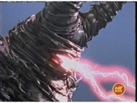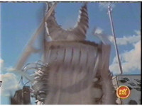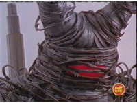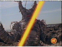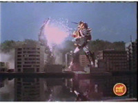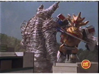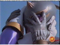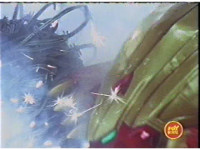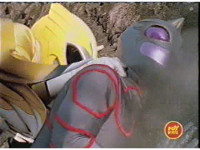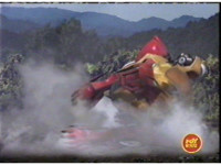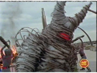 Wild Force Megazord sparkily slashes Barbed Wire Org back with its Fin Blade. |