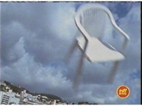 A chair is thrown through the air, crashing into Barbed Wire Org. |