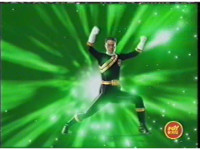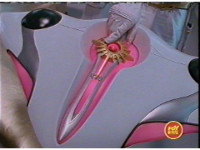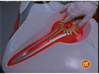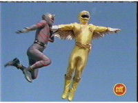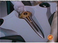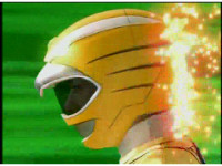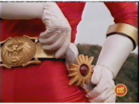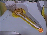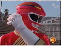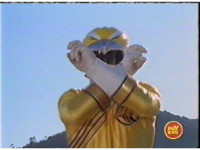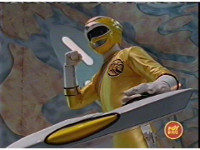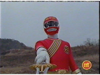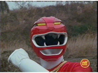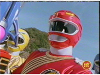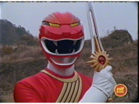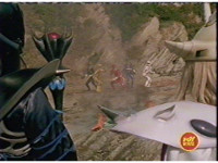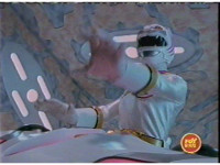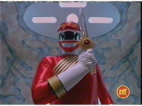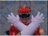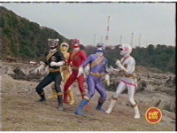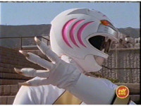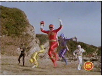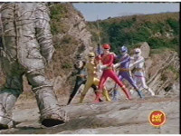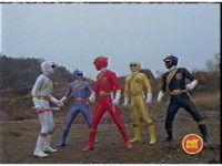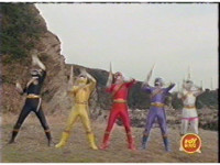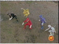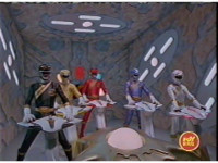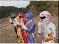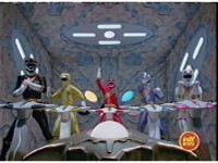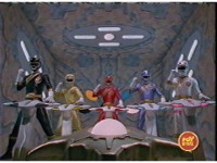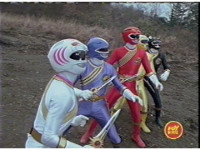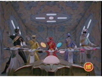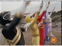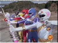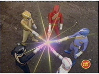The Rangers recover, Blue talks to White, Red then talks, before leading the team in pulling out Crystal Sabers and aiming them skyward. |