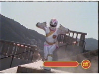 White gestures her arm forth, and Wild Force Megazord punches its White Tiger fist forth repeatedly, spark bursting Barbed Wire Org. |