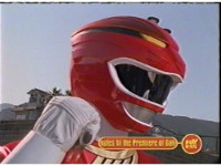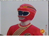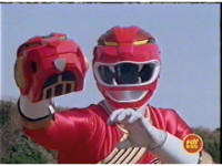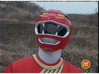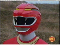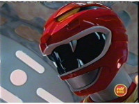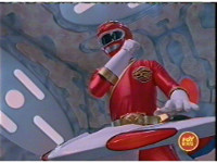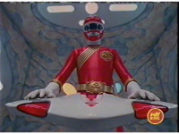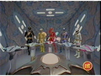 The Rangers stand inside Red Lion's brain, until the place shifts around, becoming a standing cockpit with platforms for each, Red steps forth to his and nod-talks. |