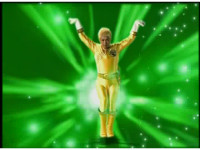 Red Lion leaps over an overpass then lunges toward Barbed Wire Org, sparkily biting his arm, until the Org fires an eyebeam that blasts him down. |