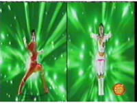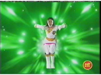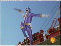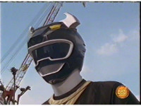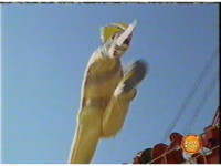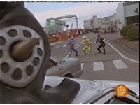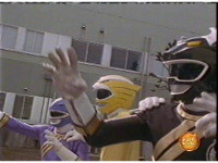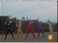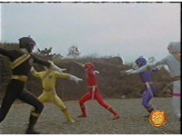 Black, Blue & Yellow leap in, Tire Org turns, Yellow double kicks him in the chest, but bounces off, lands with her two teammates, then recovers and talks, clenching fists. Tire Org responds, then Black talks, Yellow grabs Blue & Black's shoulders, while speaking ,then all pose and rush forth. |