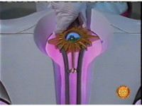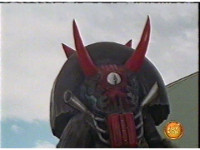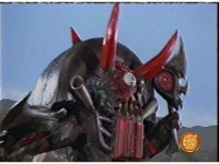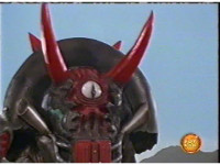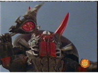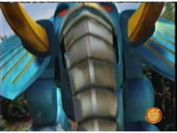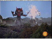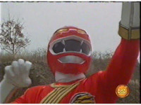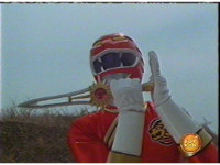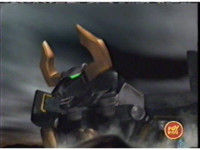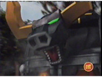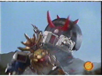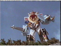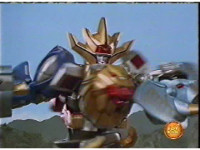 Red Lion roars, Bison's back shifts around into legs, Eagle locks in her wings behind Red Lion's chest head, causing the Wild Force Megazord's head to the pop up out of her, eyes glowing. |