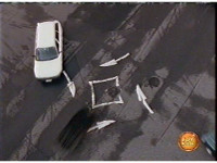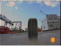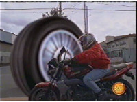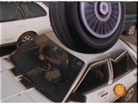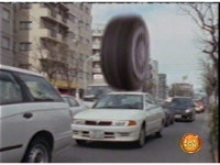 Tire Org rolls through an intersection, causing cars to swerve, then bounces atop cars stuck in traffic, crushing one car's roof. |