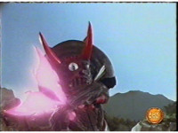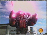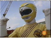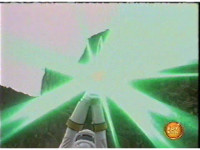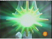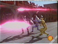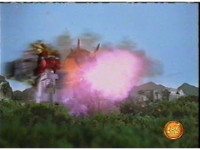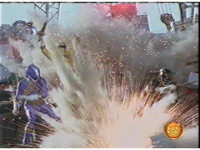Tire Org readies his tire blades, which glow, as he flings them forth, sparkily bursting the Rangers. |