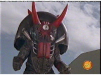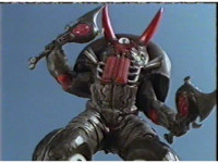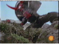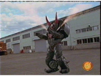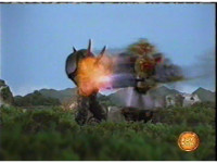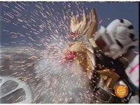 Wild Force Megazord punches its fists at Tire Org to no effect, so the Org takes his tire blades and sparkily slashes the Megazord back. |