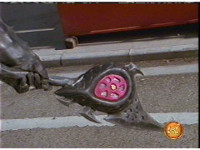 Tire Org readies his blades, then is back in tire mode, rolling forth and sparkily smashing into Wild Force Megazord, shaking up the cockpit. |