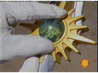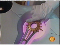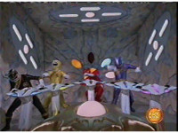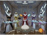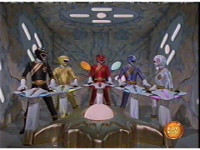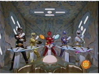 Inserting their Crystal Sabers in their slots, the Rangers watch as they glow, and then look forth. |