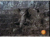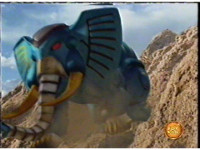 The mountainside gleams then shatters as Elephantzord breaks out, White reacting, as Elephantzord shakes his head and trumpets. |
