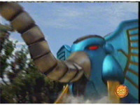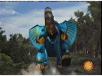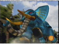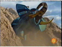 Wild Force Megazord in Sword & Shield Mode performs the Pachyderm Crusher Attack. |