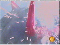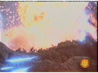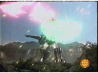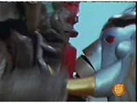 Tire Org reacts, then tosses his charged blades forth, White raises a fist and nod-talks, and Wild Force Megazord reflects the blades, with its glowing Elephant Shield, the blades falling harmlessly as Tire Org reacts. |