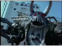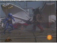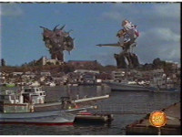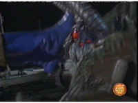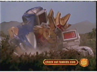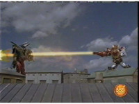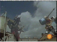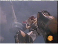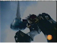 Wild Force Megazord and Ship Org pose battle ready at each other a few times, before the Megazord charges forth. |