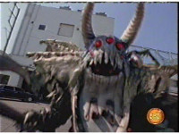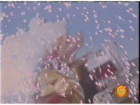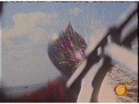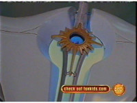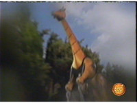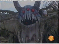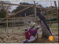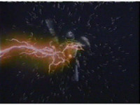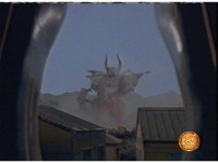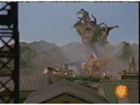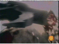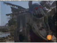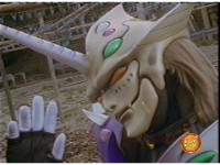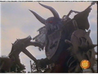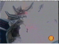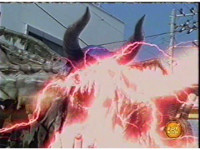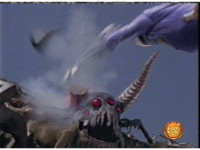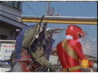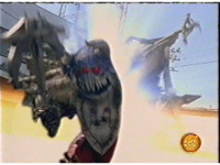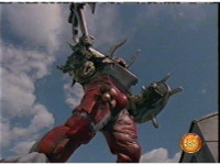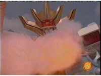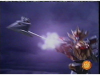 Ship Org turns and Giraffezord comes to a stop, where he proceeds to whip his neck from side to side, sparkily knocking the Org down. |