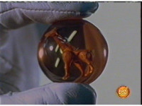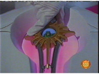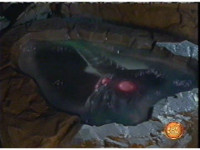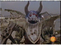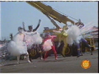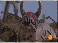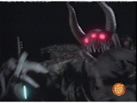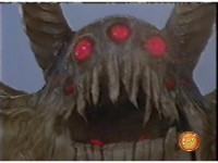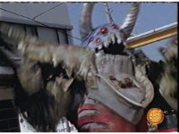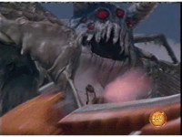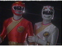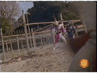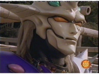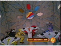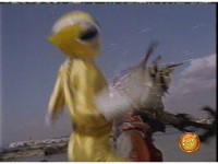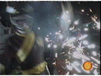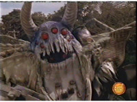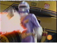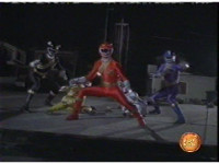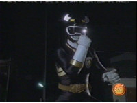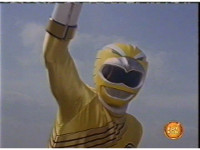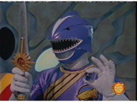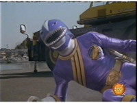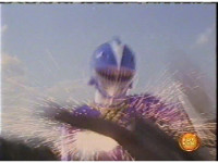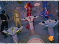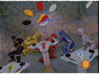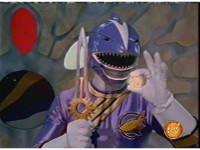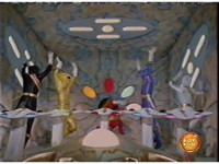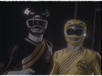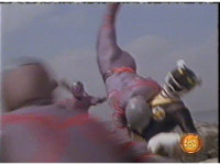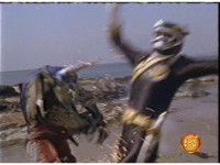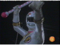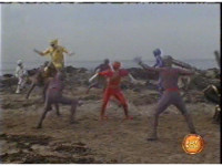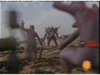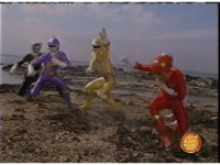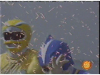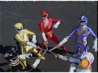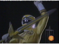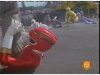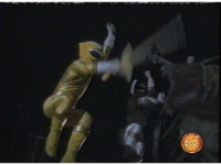 Ship Org sparkily slashes Black and a Putrid, then Blue, then a Putrid, then Yellow fights him, and gets sparkily slashed down, the Rangers regrouping as Yellow poses and talks. |