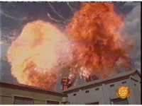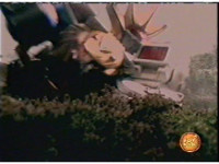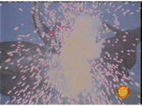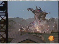 Wild Force Megazord in Sword & Shield Mode staggers back, gets sparkily struck twice, explosions burst around it, the Rangers are thrown down, the Elephant Armor falls off, the Megazord falls over, and Blue's Crystal Saber falls beside him. |