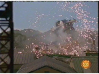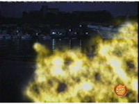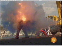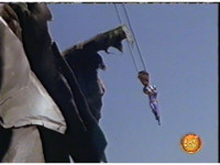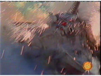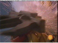The anchor is tossed, sparkily striking Wild Force Megazord, shaking up the cockpit, before explosions burst around it, causing it to drop its Elephant Armor, then fall over. |