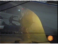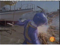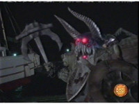 Ship Org sparkily bashes the downed Wild Force Megazord with his anchor repeatedly. |