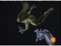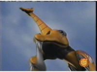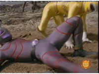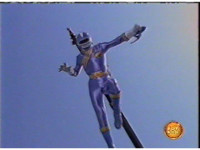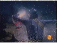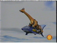 As Giraffezord races along, Sharkzord flies in and approaches him from behind, the Giraffe then jumps up and mounts the Shark, riding him into the sky. |