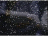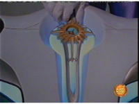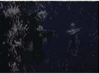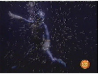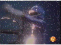 Underwater, Ship Org sparkily slashes Blue twice, knocking him away, but he pulls out his Crystal Saber and swims back, just to get sparkily blasted by the Org. |