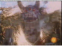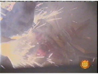 The flaming Spear impales through Ship Org's shield, bursting it with sparks, Ship Org's eyes blinking on and off, before Wild Force Megazord pulls its Spear arm back, and poses with it. |