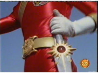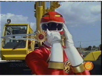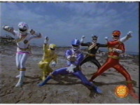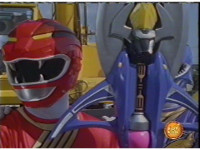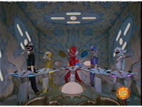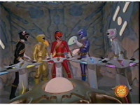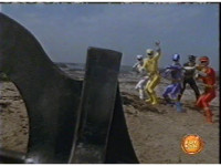 The Rangers regroup around Blue, Red with Lion Blaster, as Ship Org aims his anchor at them and talks, Red then touches his patch and motions his arm around into a fist, nod-talks, then leads the team into doing a group pose. |