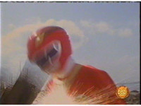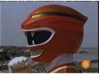 The Rangers are looking upward, still holding their Sabers together, when we zoom in on Red talking and gesturing an arm. |
