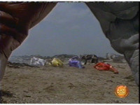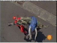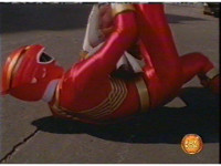 The Rangers scramble off the beach onto pavement, as Ship Org fires a blast, smoke bursting them all down, where Blue quickly recovers and talks, before Red also recovers and charges forth. |