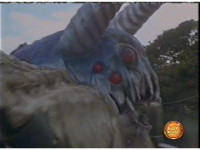 Blue readies a Fighting Fin, then drops right on top of Ship Org, cutting off one of his horns, giving Red the chance to kick him off, knocking him down. |