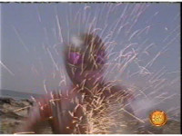 Blue rolls onto the beach, and gets sparkily struck by Ship Org several times, until he falls down, where he sits up and talks, the Org approaching, until he suddenly spark bursts, Blue reacting. |