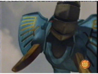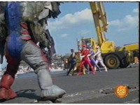 Wild Force Megazord gets back up, the Rangers react, Red pointing, Blue nod-talking. |