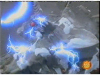 Wild Force Megazord in Sword & Shield Mode staggers back, gets sparkily struck twice, explosions burst around it. |