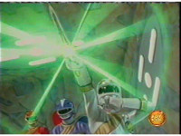 Red pulls out the Lion Blaster, fires it, Ship Org reflects the beams back at the Rangers sparkily. |
