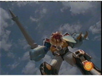 Red Lion jumps forth with ignited back thrusters, he then shifts about, Shark, White Tiger, and Eagle doing the same, all connecting together atop Bison. |