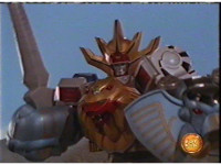 Wild Force Megazord in Spear Mode aims its Giraffezord arm forth, Ship Org gets up, talks, and raises his shield. |