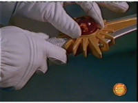Inserting their Crystal Sabers in their slots, the Rangers watch as they glow, and then look forth. |
