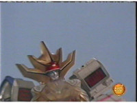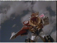 Red Lion roars, Bison's back shifts around into legs, Eagle locks in her wings behind Red Lion's chest head, causing the Wild Force Megazord's head to pop up out of her, eyes glowing. |